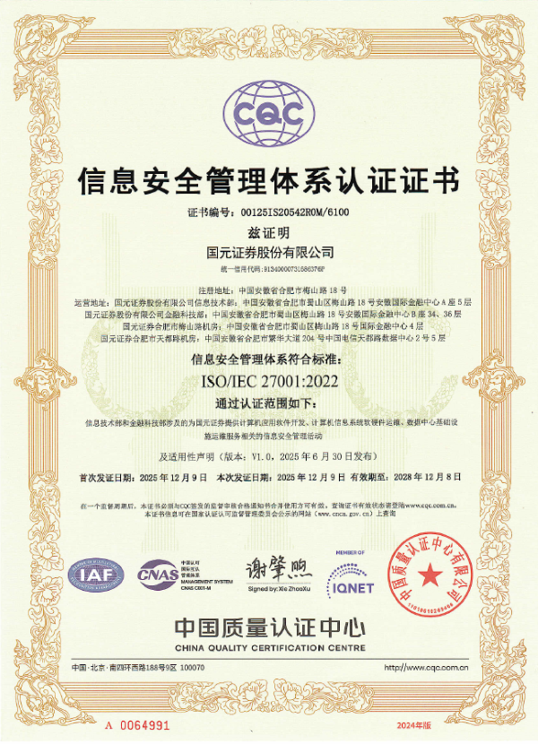 近日,经认证机构中国质量认证中心全流程严格审核,公司正式通过ISO 27001信息安全管理体系认证,成功获得ISO/IEC 27001:2022标准认证证书。这一里程碑标志着公司信息安全管理已建立符合国际标准的制度化、规范化体系,为公司业务稳健运营和数字化转型提供了坚实保障。
