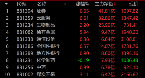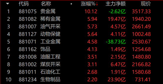盘面上,贵金属、稀有金属、油气开采、动物保健等板块涨幅居前;航天装备、体育、林业、军工电子等板块领跌。